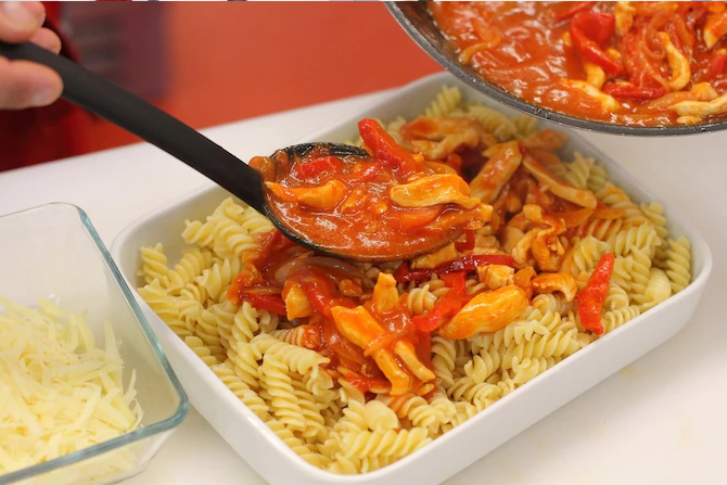 - Makaron wyłóż do naczynia żaroodpornego, zalej sosem i posyp startym serem. Włóż do piekarnika nagrzanego do 180 stopni na 20 minut. Następnie podawaj.